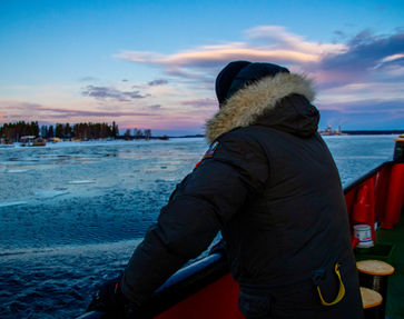 An experience for all the senses. Snow-white landscape in midwinter darkness. Candelabra, linen tablecloths, crackling fire and a three-course gourmet dinner. Everything on ice. Literally. We are out on the Gulf of Bothnia. The knowledge that the sea is below us gives dinner a new dimension.